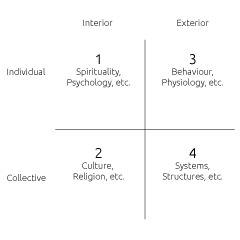 This insight — the importance of perspective-taking — is the first basic tenet of Integral thought. In the framework developed by Ken Wilber, which I’ll be using to guide this series, perspective-taking is formalized as Quadrants. Our understanding of the world, according to Wilber, is based on the interaction of two sets of variables: First, there is our inner experience of something and the outer expression of it. For example, our experience of meditation might be one of ‘calm and relaxation’, while it might be expressed as ‘sitting in lotus position,’ ‘slowed breathing’ or ‘reduced blood pressure.’ And second, we engage the world both as individuals and in community. So, Buddhist and Christian monks might share similar experiences in meditation, but they will interpret them differently because of the different beliefs of their traditions. If we were to plot these two variables in chart, they would create four quadrants: