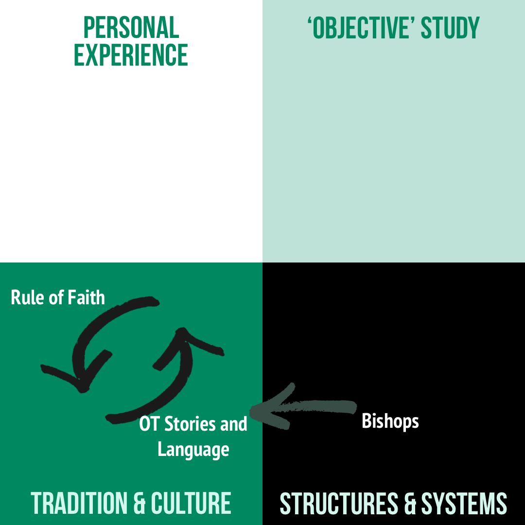 If we place this position that emerged through the second century within the four quadrants of Integral theory, we see a movement here away from the upper left quadrant and an almost exclusive reliance on the lower left quadrant of tradition and collective experience. The authority of these traditions were bolstered by recourse to the lower right quadrant of systems and structures: Here we see the establishment of the office of Bishops as a structural mechanism to ensure the tradition was being passed down accurately. (Of course, the degree to which this mechanism succeeded was an open one, and one that would fuel the Reformation a fourteen-hundred years later!)