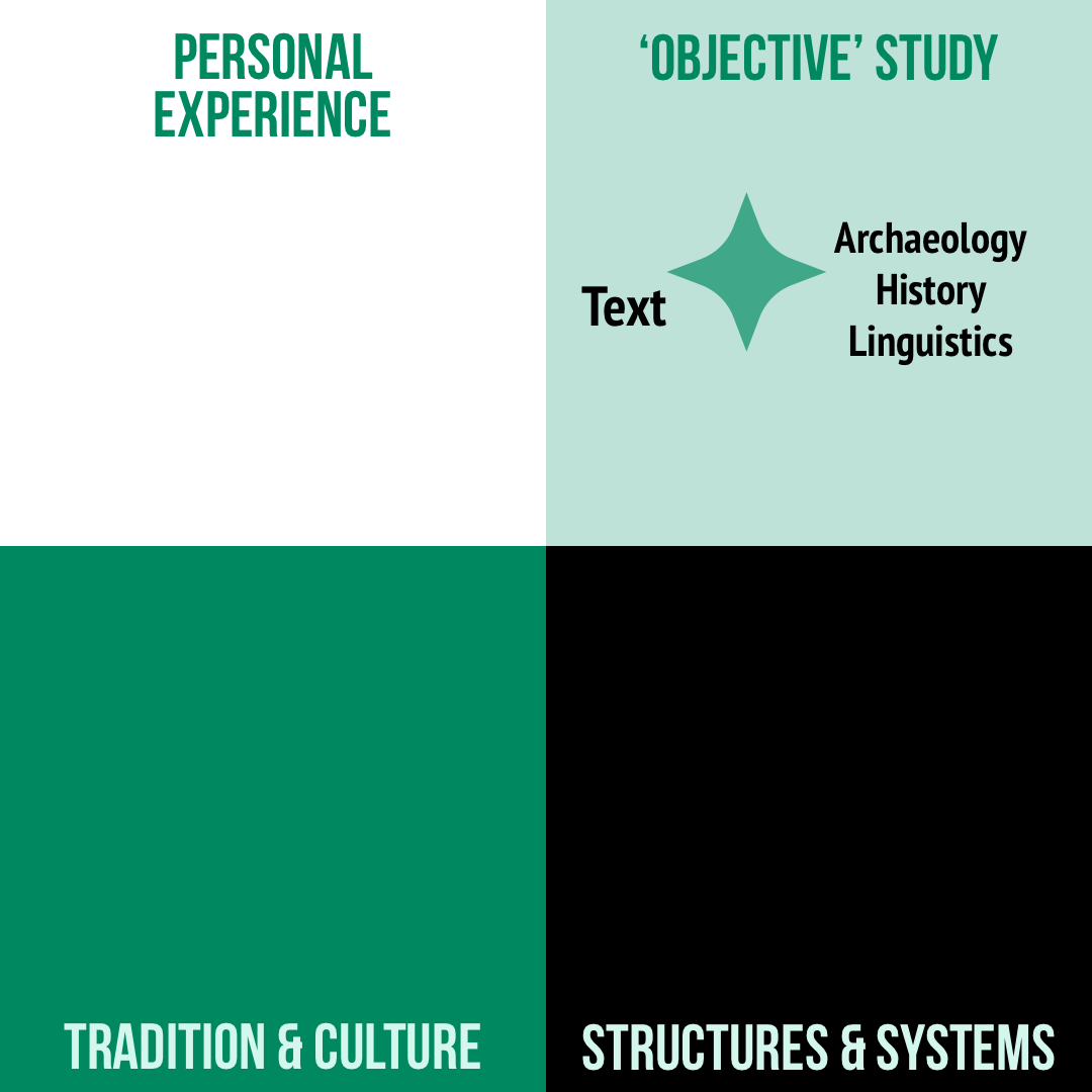 If we look at these critical methodologies on our integral quadrant map, we see that the efforts are entirely in the upper right quadrant. The sources are the texts themselves, linguistic, historical and cultural analysis, and archaeology. This is entirely an academic, intellectual approach, with no reference to tradition (lower left), authority (lower right), or personal experience (upper left).