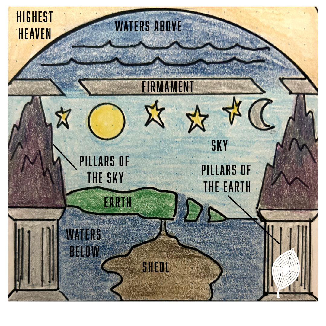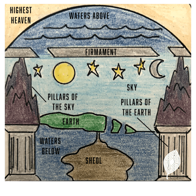 It’s clear from a cursory reading of Genesis 1 that this text is working from a very different understanding of the universe from what we’re used to. There’s a primordial ocean, a vault (’the firmament’) that holds up the waters that periodically descend in the form of rain or snow (see Genesis 7.11 for this detail). The ‘waters below’ are collected together to reveal the land, and the sun, moon, and stars are placed to move across the vault according to a regular pattern. Nothing about this is unique to Genesis 1 or to the Bible as a whole; rather it conforms to the generally accepted cosmology of the Ancient Near East (ANE) (Barton & Muddiman 42, Walton & Keener, Barker, etc.).* To put this general ANE cosmology into a picture, it looks something like this (pardon my hand-drawn and coloured diagram!; see also Sarna (1966) 5):