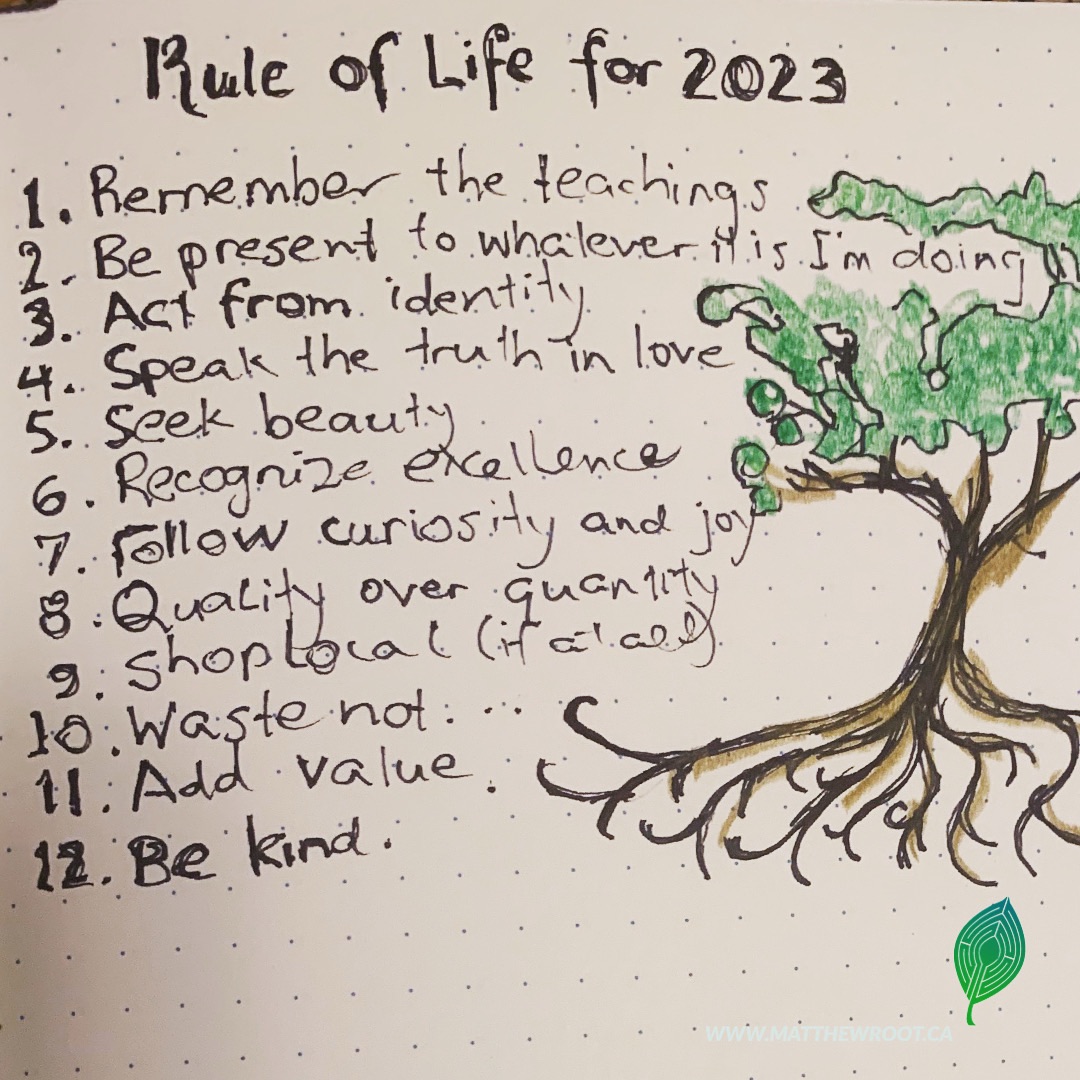 Two years ago, I developed a Rule of Life. I intended to revisit it every year, but I like it so much that I’ve left it pretty much unaltered. But last year, as I eliminated my tracking of my goals, I forgot about my Rule for big chunks of the year. So I’ve put it up on my refrigerator whiteboard and it’s been great to be reminded of these beautiful principles every time I pass it: